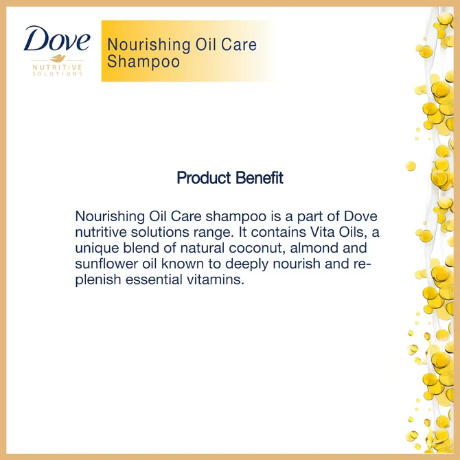 Dove Nourishing Oil Care Shampoo is inffused with Vita Oils that instantly helps tame frizzy,unruly hair and, with continuous use, provide nourishment for healthier hair.